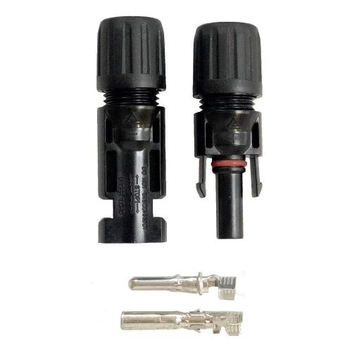 El juego de Conectores Paneles solares es indispensable para poder hacer una conexión segura y estanca de los módulos fotovoltaicos. Consta de una pareja de conectores, un conector Macho y otro conector Hembra que encajan a la perfección con los conectores que ya vienen incluidos en el panel. Es un tipo de conector muy estandarizado ya que la inmensa mayoría de los fabricantes utilizan este tipo de conector, por lo que la compatibilidad es máxima. Para poder conectar de manera apropiada una panel fotovoltaico a un sistema solar se recomienda siempre la utilización de este tipo de conector.